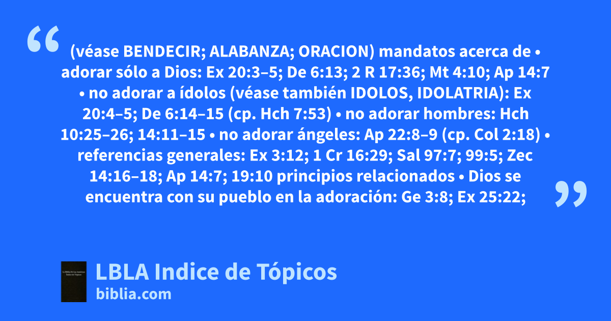 mandatos acerca de • adorar sólo a Dios: Ex 20:3–5; De 6:13; 2 R 17:36; Mt 4:10; Ap 14:7 • no adorar a ídolos (véase también IDOLOS, IDOLATRIA): Ex 20:4–5; De 6:14–15 (cp. Hch 7:53) • no adorar hombres: Hch 10:25–26; 14:11–15 • no adorar ángeles: Ap 22:8–9 (cp. Col 2:18) • referencias generales: Ex 3:12; 1 Cr 16:29; Sal 97:7; 99:5; Zec 14:16–18; Ap 14:7; 19:10