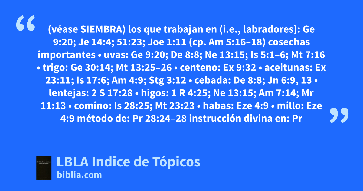 cosechas importantes • uvas: Ge 9:20; De 8:8; Ne 13:15; Is 5:1–6; Mt 7:16 • trigo: Ge 30:14; Mt 13:25–26 • centeno: Ex 9:32 • aceitunas: Ex 23:11; Is 17:6; Am 4:9; Stg 3:12 • cebada: De 8:8; Jn 6:9, 13 • lentejas: 2 S 17:28 • higos: 1 R 4:25; Ne 13:15; Am 7:14; Mr 11:13 • comino: Is 28:25; Mt 23:23 • habas: Eze 4:9 • millo: Eze 4:9