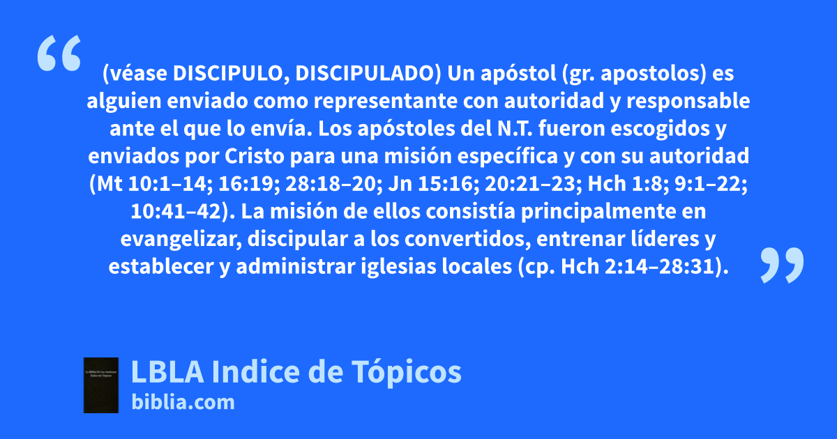 Un apóstol (gr. apostolos) es alguien enviado como representante con autoridad y responsable ante el que lo envía. Los apóstoles del N.T. fueron escogidos y enviados por Cristo para una misión específica y con su autoridad (Mt 10:1–14; 16:19; 28:18–20; Jn 15:16; 20:21–23; Hch 1:8; 9:1–22; 10:41–42). La misión de ellos consistía principalmente en evangelizar, discipular a los convertidos, entrenar líderes y establecer y administrar iglesias locales (cp. Hch 2:14–28:31). La palabra para apóstol es usada también en un sentido general como “mensajero” (2 Co 8:23; Flp 2:25).