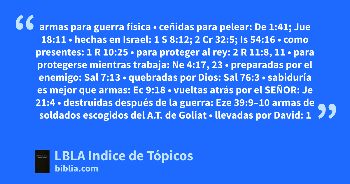 armas para guerra física • ceñidas para pelear: De 1:41; Jue 18:11 • hechas en Israel: 1 S 8:12; 2 Cr 32:5; Is 54:16 • como presentes: 1 R 10:25 • para proteger al rey: 2 R 11:8, 11 • para protegerse mientras trabaja: Ne 4:17, 23 • preparadas por el enemigo: Sal 7:13 • quebradas por Dios: Sal 76:3 • sabiduría es mejor que armas: Ec 9:18 • vueltas atrás por el SEÑOR: Je 21:4 • destruidas después de la guerra: Eze 39:9–10