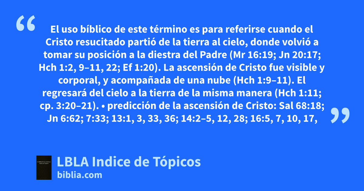 • predicción de la ascensión de Cristo: Sal 68:18; Jn 6:62; 7:33; 13:1, 3, 33, 36; 14:2–5, 12, 28; 16:5, 7, 10, 17, 28; 17:13; 20:17 (cp. Sal 110:1); Jn 3:13 • descripción de la ascensión de Cristo: Lc 24:50–51; Jn 13:1; Hch 1:9–11; 1 Ti 3:16; 1 Pe 3:22 • tiempo de la ascensión de Cristo: Hch 1:2–3, 5; 2:1–4