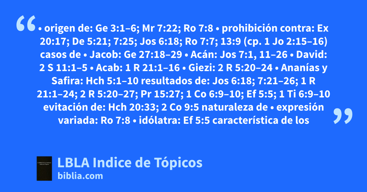CODICIA • origen de: Ge 3:1–6; Mr 7:22; Ro 7:8 • prohibición contra: Ex 20:17; De 5:21; 7:25; Jos 6:18; Ro 7:7; 13:9 (cp. 1 Jo 2:15–16)