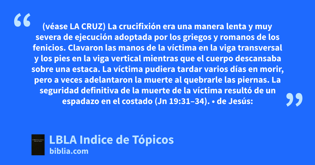 La crucifixión era una manera lenta y muy severa de ejecución adoptada por los griegos y romanos de los fenicios. Clavaron las manos de la víctima en la viga transversal y los pies en la viga vertical mientras que el cuerpo descansaba sobre una estaca. La víctima pudiera tardar varios días en morir, pero a veces adelantaron la muerte al quebrarle las piernas. La seguridad definitiva de la muerte de la víctima resultó de un espadazo en el costado (Jn 19:31–34).