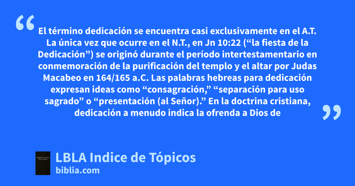 El término dedicación se encuentra casi exclusivamente en el A.T. La única vez que ocurre en el N.T., en Jn 10:22 (“la fiesta de la Dedicación”) se originó durante el período intertestamentario en conmemoración de la purificación del templo y el altar por Judas Macabeo en 164/165 a.C. Las palabras hebreas para dedicación expresan ideas como “consagración,” “separación para uso sagrado” o “presentación (al Señor).” En la doctrina cristiana, dedicación a menudo indica la ofrenda a Dios de uno mismo o de material, o de las dos cosas para propósitos santos.