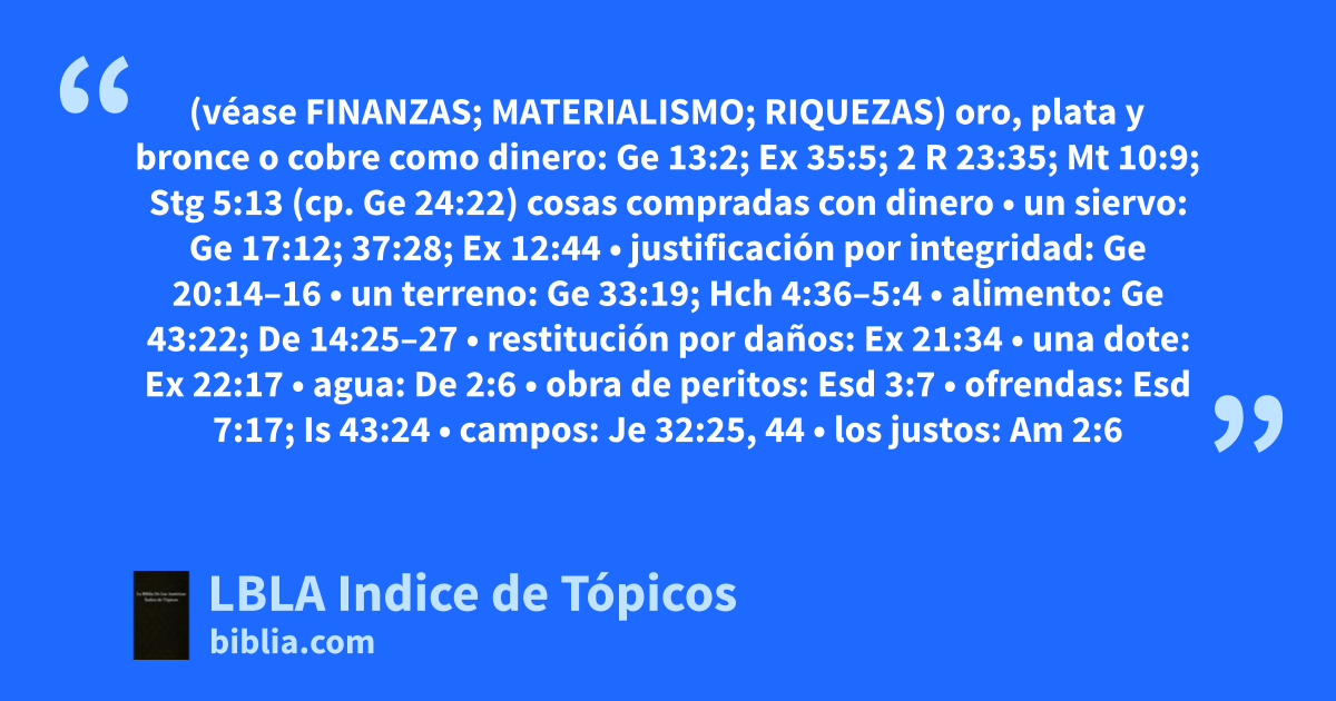 cosas compradas con dinero • un siervo: Ge 17:12; 37:28; Ex 12:44 • justificación por integridad: Ge 20:14–16 • un terreno: Ge 33:19; Hch 4:36–5:4 • alimento: Ge 43:22; De 14:25–27 • restitución por daños: Ex 21:34 • una dote: Ex 22:17 • agua: De 2:6 • obra de peritos: Esd 3:7 • ofrendas: Esd 7:17; Is 43:24 • campos: Je 32:25, 44 • los justos: Am 2:6 • los desvalidos: Am 8:6 • ciudadanía romana: Hch 22:28