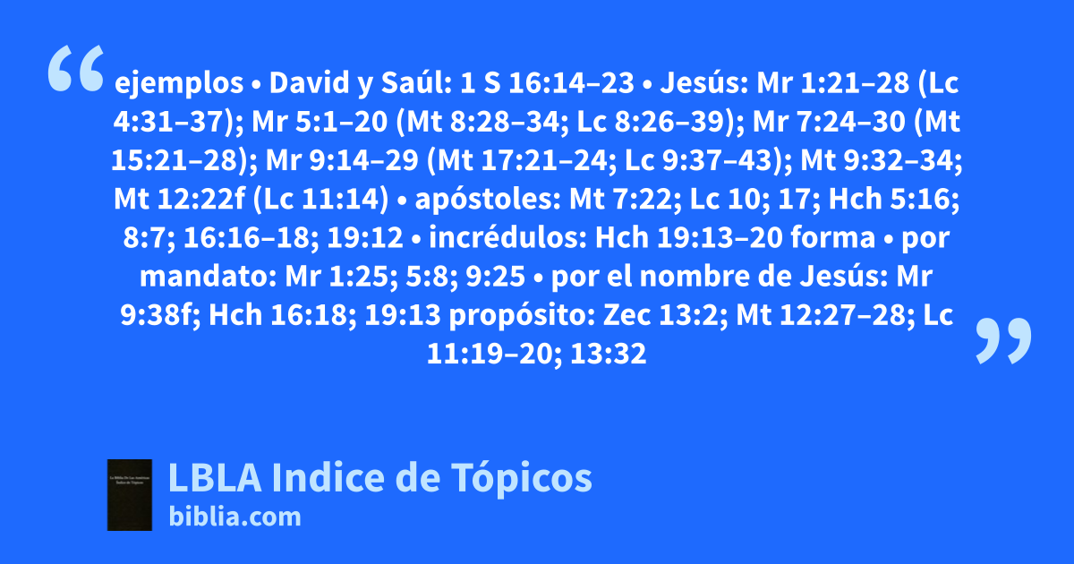 ejemplos • David y Saúl: 1 S 16:14–23 • Jesús: Mr 1:21–28 (Lc 4:31–37); Mr 5:1–20 (Mt 8:28–34; Lc 8:26–39); Mr 7:24–30 (Mt 15:21–28); Mr 9:14–29 (Mt 17:21–24; Lc 9:37–43); Mt 9:32–34; Mt 12:22f (Lc 11:14) • apóstoles: Mt 7:22; Lc 10; 17; Hch 5:16; 8:7; 16:16–18; 19:12 • incrédulos: Hch 19:13–20