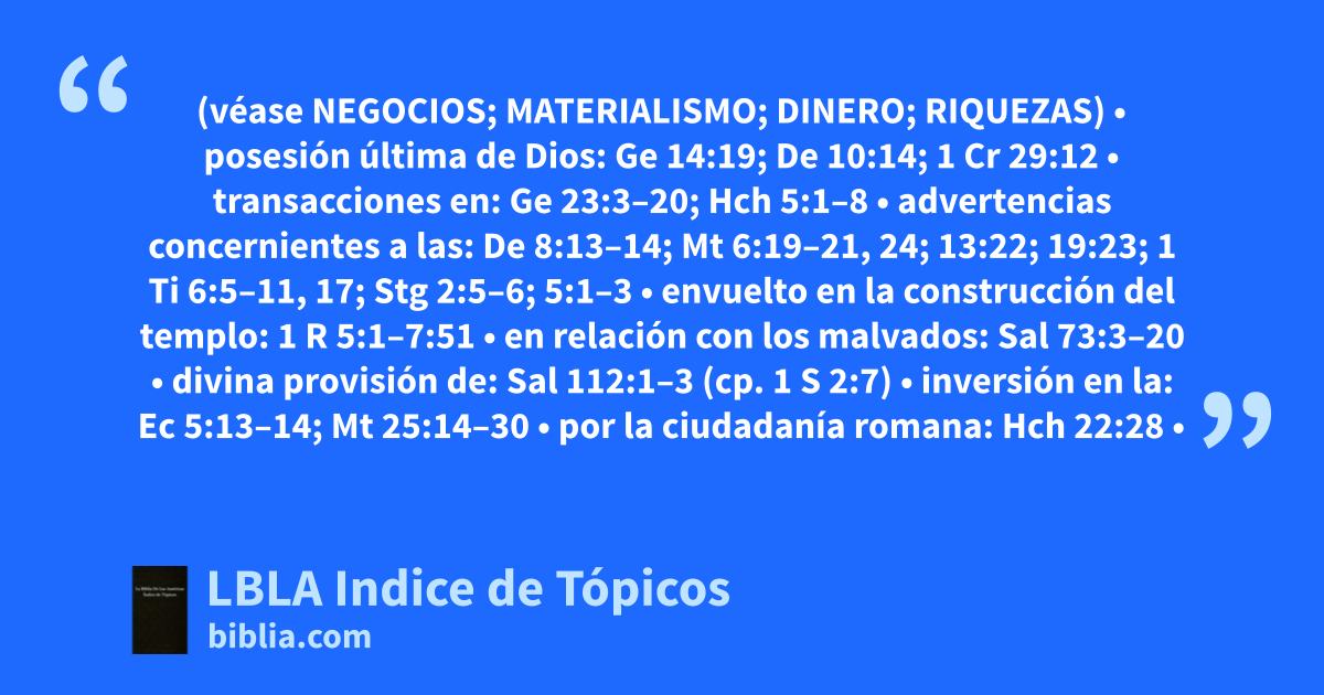 FINANZAS (véase NEGOCIOS; MATERIALISMO; DINERO; RIQUEZAS) • posesión última de Dios: Ge 14:19; De 10:14; 1 Cr 29:12 • transacciones en: Ge 23:3–20; Hch 5:1–8 • advertencias concernientes a las: De 8:13–14; Mt 6:19–21, 24; 13:22; 19:23; 1 Ti 6:5–11, 17; Stg 2:5–6; 5:1–3 • envuelto en la construcción del templo: 1 R 5:1–7:51 • en relación con los malvados: Sal 73:3–20 • divina provisión de: Sal 112:1–3 (cp. 1 S 2:7) • inversión en la: Ec 5:13–14; Mt 25:14–30 • por la ciudadanía romana: Hch 22:28 • responsabilidades concernientes a: Ro 13:6–8; Stg 1:9–11 (cp. 1 Ti 5:8) • obtenida en una empresa de negocio: Stg 4:13 • derrumbe de las: Ap 18:9–23