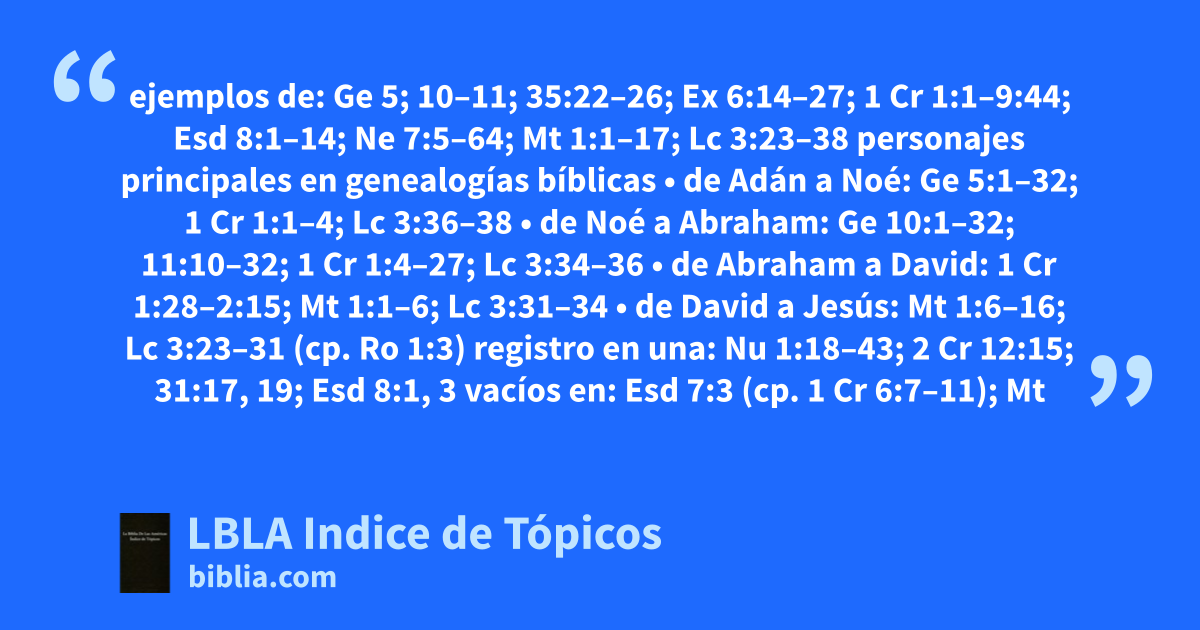 ejemplos de: Ge 5; 10–11; 35:22–26; Ex 6:14–27; 1 Cr 1:1–9:44; Esd 8:1–14; Ne 7:5–64; Mt 1:1–17; Lc 3:23–38