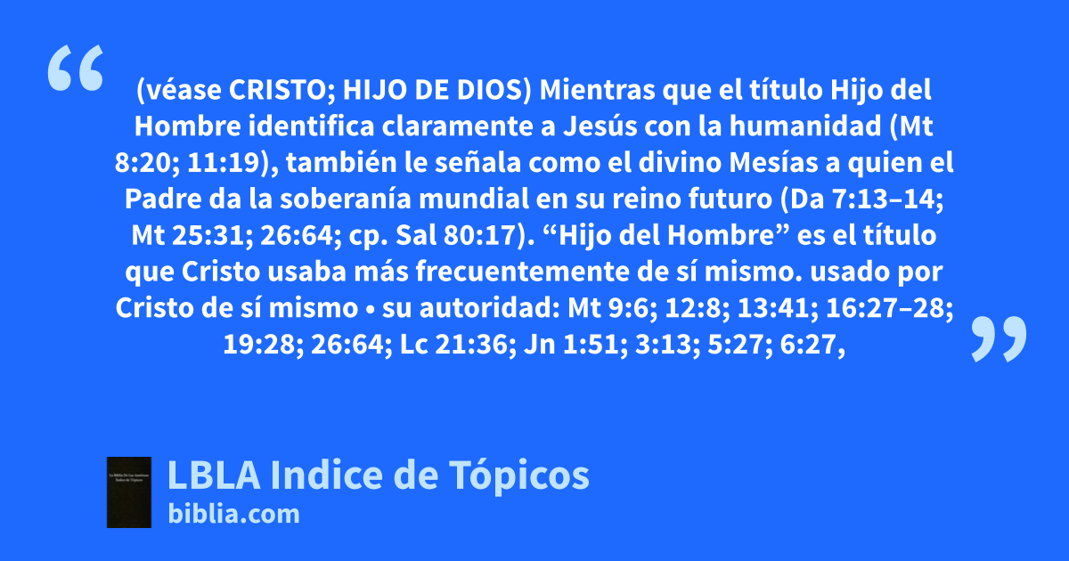 Mientras que el título Hijo del Hombre identifica claramente a Jesús con la humanidad (Mt 8:20; 11:19), también le señala como el divino Mesías a quien el Padre da la soberanía mundial en su reino futuro (Da 7:13–14; Mt 25:31; 26:64; cp. Sal 80:17). “Hijo del Hombre” es el título que Cristo usaba más frecuentemente de sí mismo.