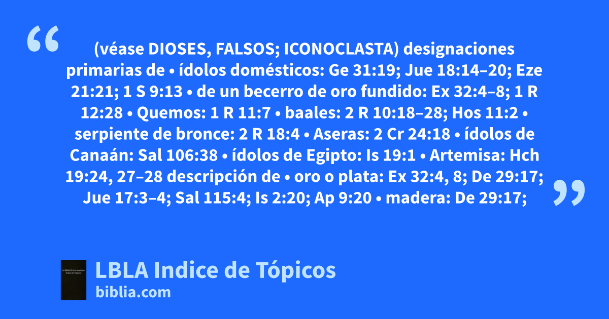 descripción de • oro o plata: Ex 32:4, 8; De 29:17; Jue 17:3–4; Sal 115:4; Is 2:20; Ap 9:20 • madera: De 29:17; Je 10:8 • piedra: De 29:17 • detestable: 1 R 11:5 • hecho por manos humanas: Sal 115:4; Is 40:18–19 • mudos: Sal 115:5, 7; Hab 2:18; 1 Co 12:2 • sin percepción sensorial: Sal 115:5–7 • no pueden actuar: Sal 115:7; Is 48:5 • no pueden predecir el futuro: Is 41:26–29 • sin provecho: Is 44:9; Hab 2:18 • inmóviles: Is 45:20 • incapaces de salvar: Is 45:20 • impotentes: Is 46:1–2 • son nada: 1 Co 8:4 (cp. 10:19)