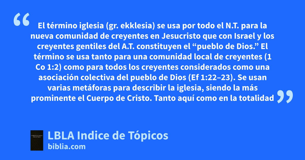 El término iglesia (gr. ekklesia) se usa por todo el N.T. para la nueva comunidad de creyentes en Jesucristo que con Israel y los creyentes gentiles del A.T. constituyen el “pueblo de Dios.” El término se usa tanto para una comunidad local de creyentes (1 Co 1:2) como para todos los creyentes considerados como una asociación colectiva del pueblo de Dios (Ef 1:22–23). Se usan varias metáforas para describir la iglesia, siendo la más prominente el Cuerpo de Cristo. Tanto aquí como en la totalidad de la enseñanza del N.T., el énfasis está en la unión espiritual de la iglesia con Cristo el Señor de la iglesia y la de los creyentes entre sí