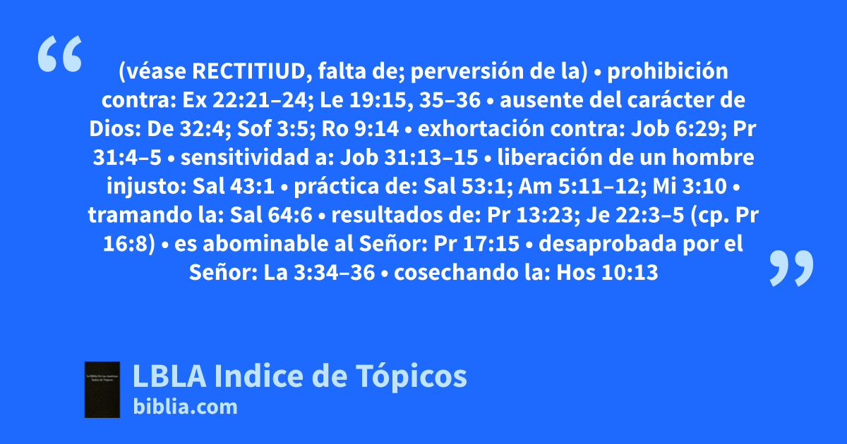 INJUSTICIA (véase RECTITIUD, falta de; perversión de la) • prohibición contra: Ex 22:21–24; Le 19:15, 35–36 • ausente del carácter de Dios: De 32:4; Sof 3:5; Ro 9:14 • exhortación contra: Job 6:29; Pr 31:4–5 • sensitividad a: Job 31:13–15 • liberación de un hombre injusto: Sal 43:1 • práctica de: Sal 53:1; Am 5:11–12; Mi 3:10 • tramando la: Sal 64:6 • resultados de: Pr 13:23; Je 22:3–5 (cp. Pr 16:8) • es abominable al Señor: Pr 17:15 • desaprobada por el Señor: La 3:34–36 • cosechando la: Hos 10:13