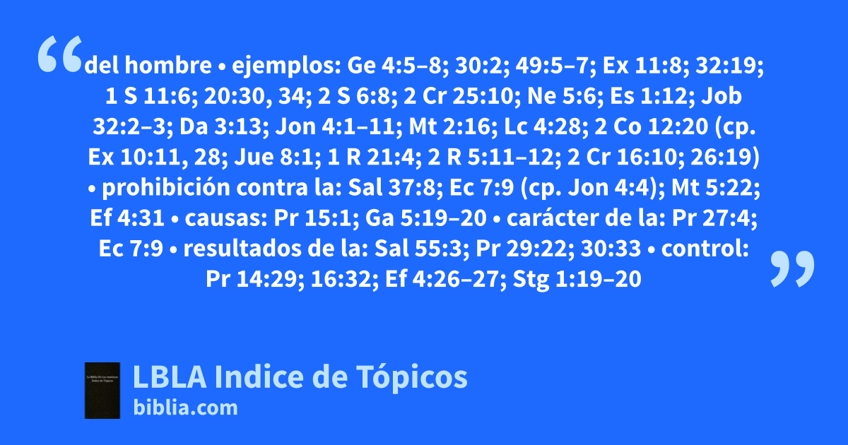 del hombre • ejemplos: Ge 4:5–8; 30:2; 49:5–7; Ex 11:8; 32:19; 1 S 11:6; 20:30, 34; 2 S 6:8; 2 Cr 25:10; Ne 5:6; Es 1:12; Job 32:2–3; Da 3:13; Jon 4:1–11; Mt 2:16; Lc 4:28; 2 Co 12:20 (cp. Ex 10:11, 28; Jue 8:1; 1 R 21:4; 2 R 5:11–12; 2 Cr 16:10; 26:19) • prohibición contra la: Sal 37:8; Ec 7:9 (cp. Jon 4:4); Mt 5:22; Ef 4:31 • causas: Pr 15:1; Ga 5:19–20 • carácter de la: Pr 27:4; Ec 7:9 • resultados de la: Sal 55:3; Pr 29:22; 30:33 • control: Pr 14:29; 16:32; Ef 4:26–27; Stg 1:19–20 • castigo: Pr 19:19; Am 1:11; Mt 5:22 • respuesta a la: Sal 94:1; Pr 22:24–25; Ro 12:19