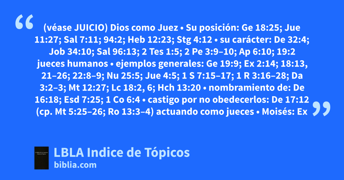 Dios como Juez • Su posición: Ge 18:25; Jue 11:27; Sal 7:11; 94:2; Heb 12:23; Stg 4:12 • su carácter: De 32:4; Job 34:10; Sal 96:13; 2 Tes 1:5; 2 Pe 3:9–10; Ap 6:10; 19:2