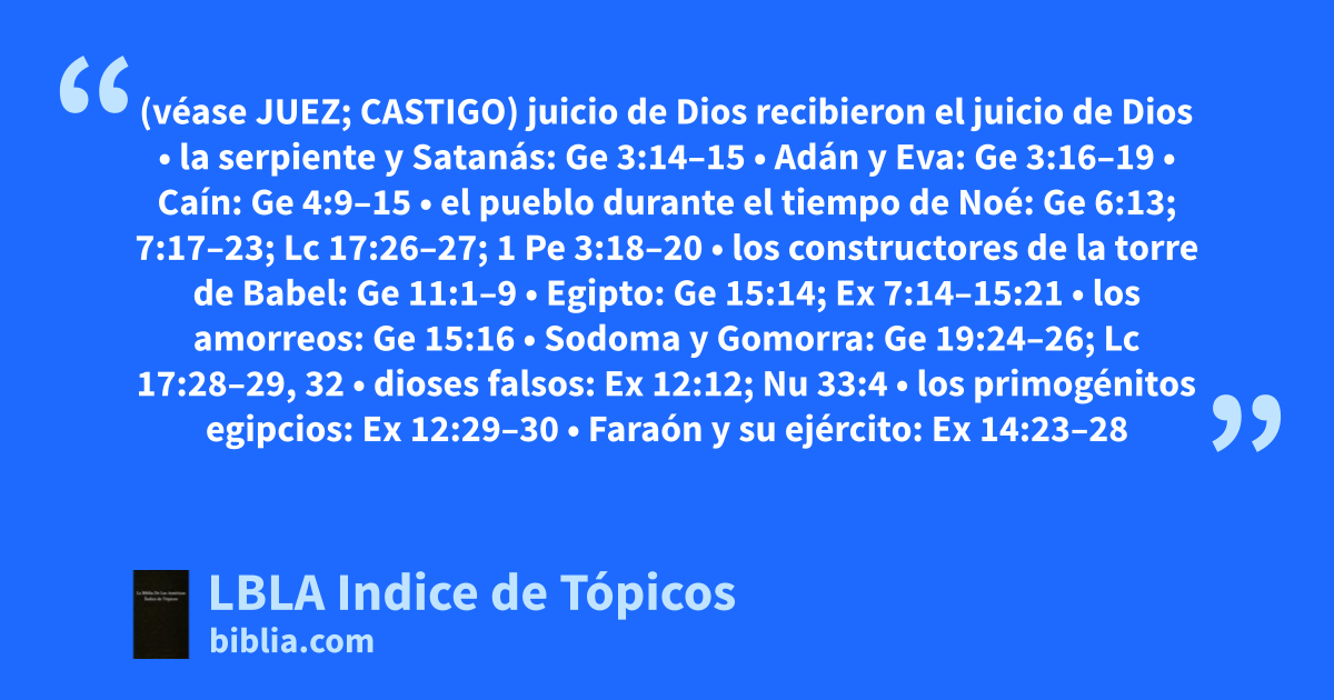 recibieron el juicio de Dios • la serpiente y Satanás: Ge 3:14–15 • Adán y Eva: Ge 3:16–19 • Caín: Ge 4:9–15 • el pueblo durante el tiempo de Noé: Ge 6:13; 7:17–23; Lc 17:26–27; 1 Pe 3:18–20 • los constructores de la torre de Babel: Ge 11:1–9 • Egipto: Ge 15:14; Ex 7:14–15:21 • los amorreos: Ge 15:16 • Sodoma y Gomorra: Ge 19:24–26; Lc 17:28–29, 32 • dioses falsos: Ex 12:12; Nu 33:4 • los primogénitos egipcios: Ex 12:29–30 • Faraón y su ejército: Ex 14:23–28 • Aarón y Miriam: Nu 12:1–15 • los israelitas rebeldes en el desierto: Nu 14:26–35 • Coré, Datán y Abiram y sus familias: Nu 16:25–35 • Acán y su familia: Jos 7:16–26 • Israel durante los jueces: Jue 2:11–23 • toda la tierra: 1 S 2:10; 1 Cr 16:33; Sal 96:13; Heb 12:23 • Elí y sus descendientes: 1 S 3:12–13 • Saúl por su desobediencia: 1 S 15:22–23; 28:15–19 • David por su pecado con Betsabé: 2 S 11:1–12:23 • del reino unido de Israel: 2 S 24:15–16 • la familia de Acab: 2 R 9:6–10 • Israel, el reino del norte: 2 R 17:1–23 • el ejército asirio: 2 R 19:35 • Judá, el reino del sur: 2 R 24:1–4 • Jerusalén: 2 R 24:10–25:21 • el malvado: Sal 1:4–6; Mt 7:23; 1 Co 5:13; Jud 15; Ap 21:8 • el pueblo de Dios: Sal 135:14; Eze 20:35–36; Heb 10:30; 1 Co 11:32; 1 Pe 4:17 • naciones enemigas de Israel: Eze 38:18–22; Joe 3:2; Zec 2:8; 12:1–9 (cp. Ge 12:3) • Nabucodonosor: Da 4:29–33 • Belsasar: Da 5:24–30 • las naciones: Mt 25:31–46 • Satanás (véase también SATANAS): Mt 25:41; Ap 20:10 • ángeles malos (véase también ANGELES): Mt 25:41; 2 Pe 2:4 • Jerusalén: Lc 19:41–44 • Ananías y Safira: Hch 5:1–11 • el rey Herodes Agripa I: Hch 12:23 • Elimas el mago: Hch 13:9–11 • toda la humanidad por el pecado de Adán (véase también PECADO): Ro 5:16 • adúlteros: Heb 13:4 • los que juran: Stg 5:12 • la gran ramera: Ap 19:2 • asesinos, personas inmorales, hechiceros, idólatras y mentirosos: Ap 21:8: referencias generales: 1 R 8:32; Job 21:22; Sal 51:4; Ec 3:17; Mal 3:5; Ro 2:16; 14:10; Ap 16:5