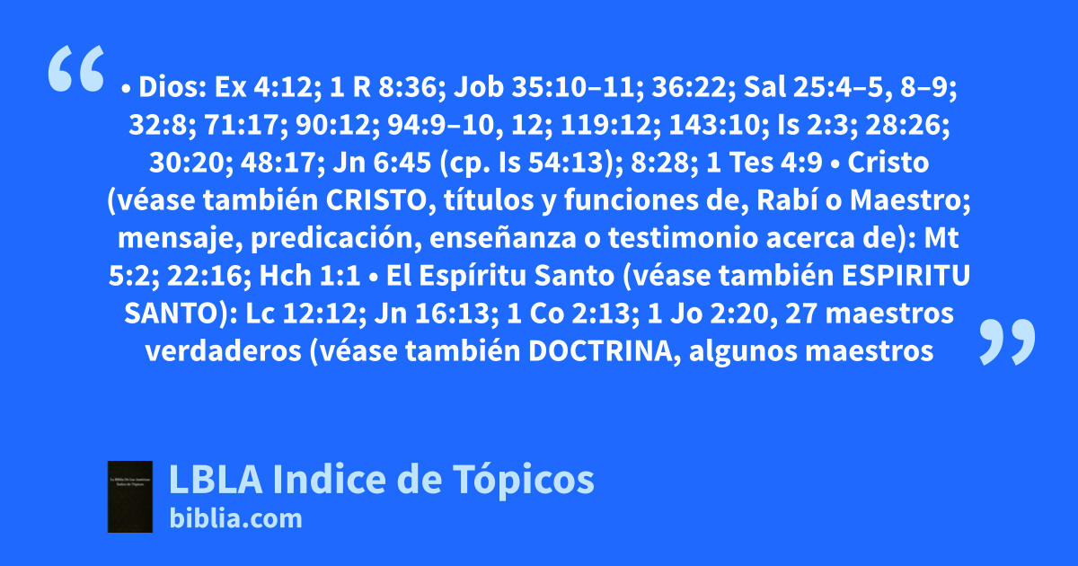 MAESTROS • Dios: Ex 4:12; 1 R 8:36; Job 35:10–11; 36:22; Sal 25:4–5, 8–9; 32:8; 71:17; 90:12; 94:9–10, 12; 119:12; 143:10; Is 2:3; 28:26; 30:20; 48:17; Jn 6:45 (cp. Is 54:13); 8:28; 1 Tes 4:9 • Cristo (véase también CRISTO, títulos y funciones de, Rabí o Maestro; mensaje, predicación, enseñanza o testimonio acerca de): Mt 5:2; 22:16; Hch 1:1 • El Espíritu Santo (véase también ESPIRITU SANTO): Lc 12:12; Jn 16:13; 1 Co 2:13; 1 Jo 2:20, 27