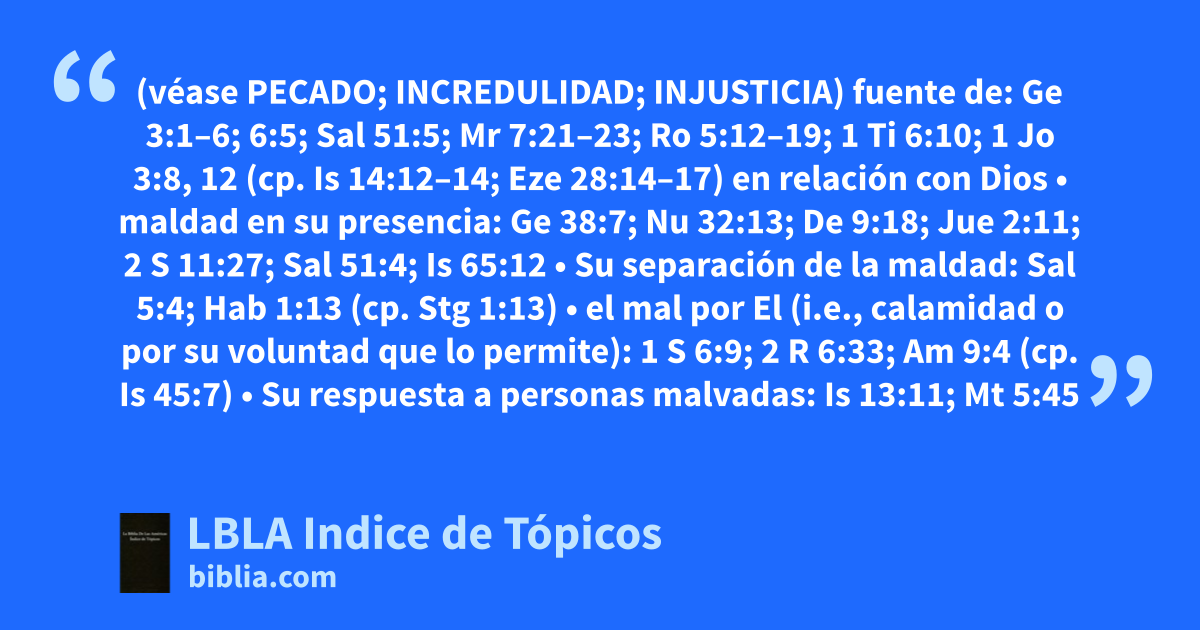 en relación con Dios • maldad en su presencia: Ge 38:7; Nu 32:13; De 9:18; Jue 2:11; 2 S 11:27; Sal 51:4; Is 65:12 • Su separación de la maldad: Sal 5:4; Hab 1:13 (cp. Stg 1:13) • el mal por El (i.e., calamidad o por su voluntad que lo permite): 1 S 6:9; 2 R 6:33; Am 9:4 (cp. Is 45:7) • Su respuesta a personas malvadas: Is 13:11; Mt 5:45
