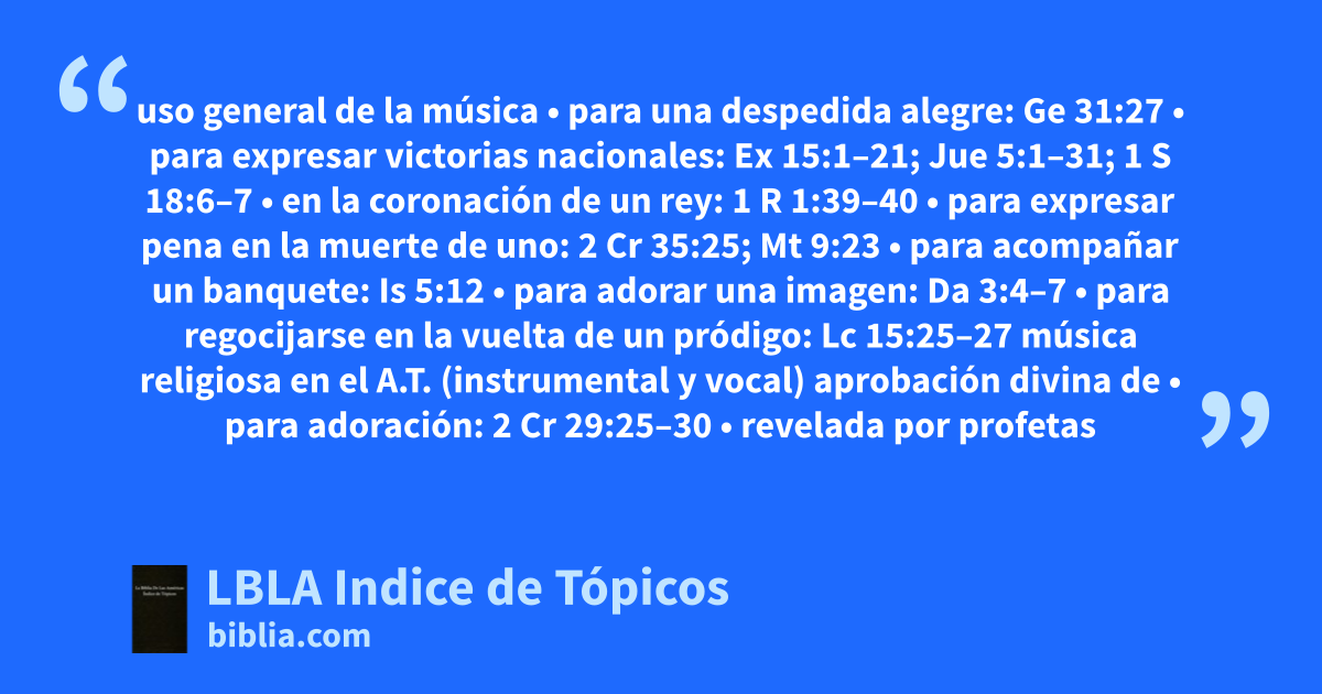 clases de • lira: Ge 4:21; 2 S 6:5; 1 Cr 15:16, 21; 16:5; 2 Cr 5:12; Sal 92:3; Da 3:5 • flauta: Ge 4:21 • campanillas: Ex 28:33–35 • arpa: 1 S 16:16; 1 Cr 15:16, 20; 16:5; 2 Cr 5:12; Sal 92:3; Is 14:11; 1 Co 14:7; Ap 18:22 (cp. 14:2) • pandero: 1 S 18:6; Sal 68:25 • castañuelas: 2 S 6:5 • címbalos resonantes: 2 S 6:5; 1 Cr 15:16, 19; 1 Cr 16:5; 2 Cr 5:12–13 • trompeta: Nu 10:2; 2 Cr 5:12–13; 7:6; 23:13; Ap 18:22 • instrumento de diez cuerdas: Sal 92:3 • cuerno: Da 3:5 • flauta: Da 3:5; Mt 9:23; 1 Co 14:7; Ap 18:22 • lira: Da 3:5 • salterio: Da 3:5 • gaita: Da 3:5: entendimiento de: 1 Co 14:7