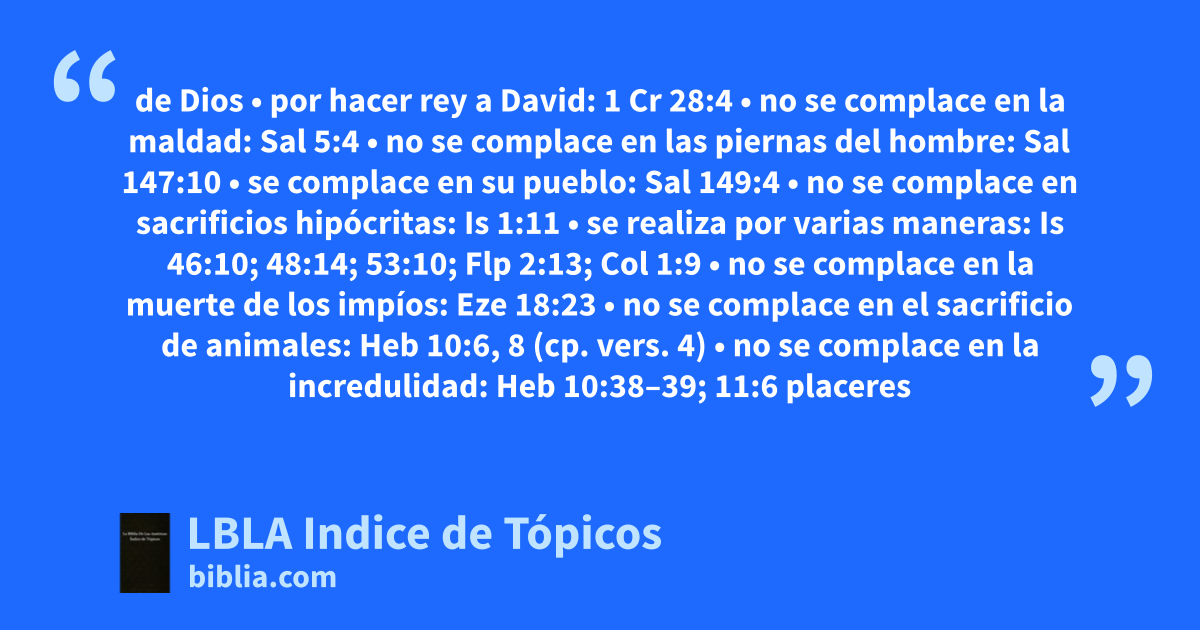 de Dios • por hacer rey a David: 1 Cr 28:4 • no se complace en la maldad: Sal 5:4 • no se complace en las piernas del hombre: Sal 147:10 • se complace en su pueblo: Sal 149:4 • no se complace en sacrificios hipócritas: Is 1:11 • se realiza por varias maneras: Is 46:10; 48:14; 53:10; Flp 2:13; Col 1:9 • no se complace en la muerte de los impíos: Eze 18:23 • no se complace en el sacrificio de animales: Heb 10:6, 8 (cp. vers. 4) • no se complace en la incredulidad: Heb 10:38–39; 11:6