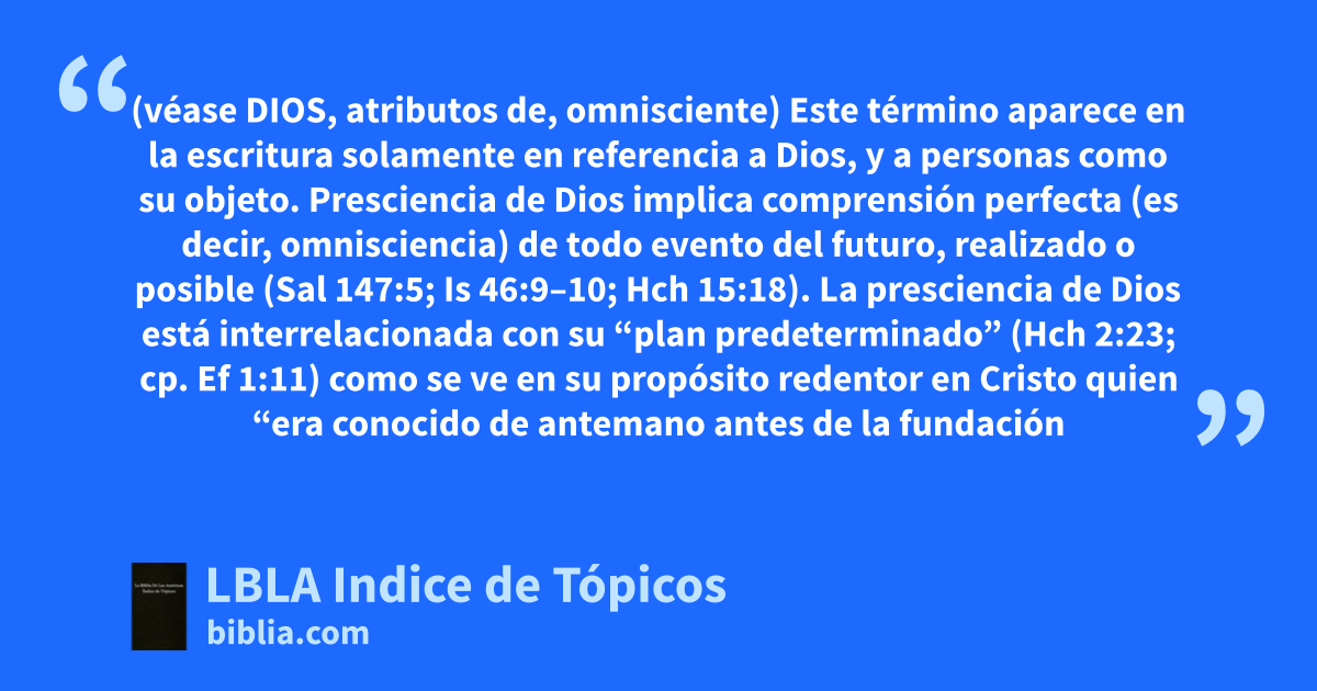 Este término aparece en la escritura solamente en referencia a Dios, y a personas como su objeto. Presciencia de Dios implica comprensión perfecta (es decir, omnisciencia) de todo evento del futuro, realizado o posible (Sal 147:5; Is 46:9–10; Hch 15:18). La presciencia de Dios está interrelacionada con su “plan predeterminado” (Hch 2:23; cp. Ef 1:11) como se ve en su propósito redentor en Cristo quien “era conocido de antemano antes de la fundación del mundo” (1 Pe 1:20). En el caso bíblico, la presciencia de Dios se aplica principalmente a los seres humanos a quienes Dios trae a una relación especial consigo mismo como su pueblo escogido (Ro 11:2, 28).