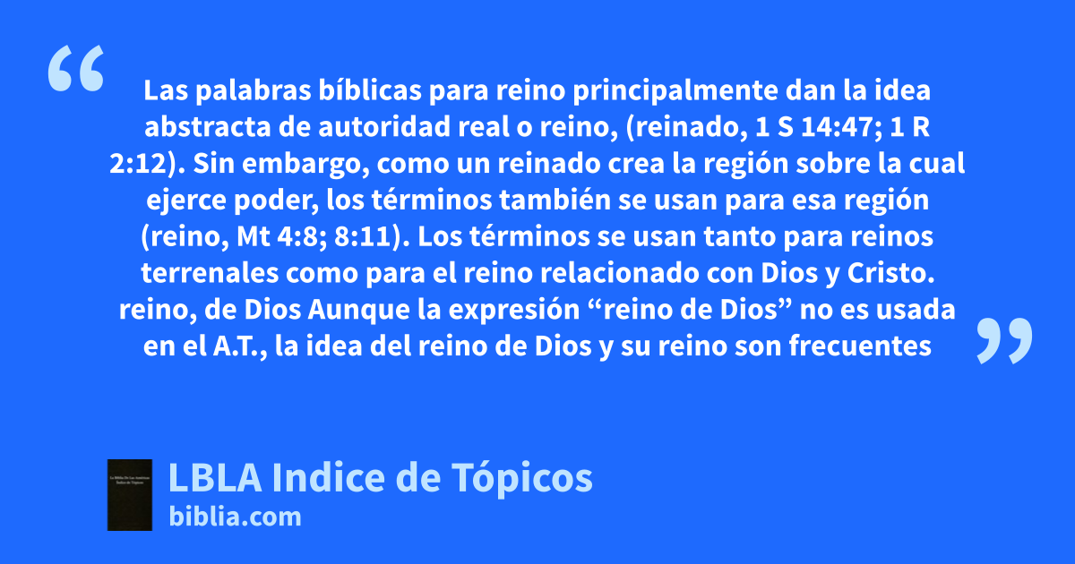 Las palabras bíblicas para reino principalmente dan la idea abstracta de autoridad real o reino, (reinado, 1 S 14:47; 1 R 2:12). Sin embargo, como un reinado crea la región sobre la cual ejerce poder, los términos también se usan para esa región (reino, Mt 4:8; 8:11). Los términos se usan tanto para reinos terrenales como para el reino relacionado con Dios y Cristo.