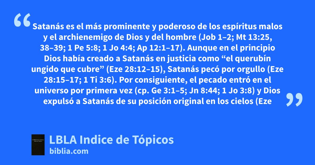 Satanás es el más prominente y poderoso de los espíritus malos y el archienemigo de Dios y del hombre (Job 1–2; Mt 13:25, 38–39; 1 Pe 5:8; 1 Jo 4:4; Ap 12:1–17). Aunque en el principio Dios había creado a Satanás en justicia como “el querubín ungido que cubre” (Eze 28:12–15), Satanás pecó por orgullo (Eze 28:15–17; 1 Ti 3:6). Por consiguiente, el pecado entró en el universo por primera vez (cp. Ge 3:1–5; Jn 8:44; 1 Jo 3:8) y Dios expulsó a Satanás de su posición original en los cielos (Eze 28:16). Retiene gran inteligencia (Eze 28:12, 17; 2 Co 2:11) y poder (Ef 6:10–12; Jud 9) y está ampliamente representado por sus demonios (Ef 6:12; Ap 12:7–9). Satanás se ha hecho gobernante sobre espíritus demoniacos, i.e., ángeles malos que también aparentemente pecaron y cayeron con él (Mt 12:24; 25:41; Ap 12:4–7). Satanás domina al mundo y puede influir en los creyentes, pero sólo dentro de la voluntad permisiva de Dios (Job 1–2, esp. 2:6; Lc 4:6; Jn 12:31; Hch 26:18; 1 Co 10:13; 1 Jo 5:19). Cristo juzgó en la cruz a Satanás (Jn 12:31; Heb 2:14; 1 Jo 3:8; cp. Col 2:15), pero la ejecución final del juicio ocurrirá cuando sea “arrojado al lago de fuego,” donde se quedará para siempre (Ap 20:10).