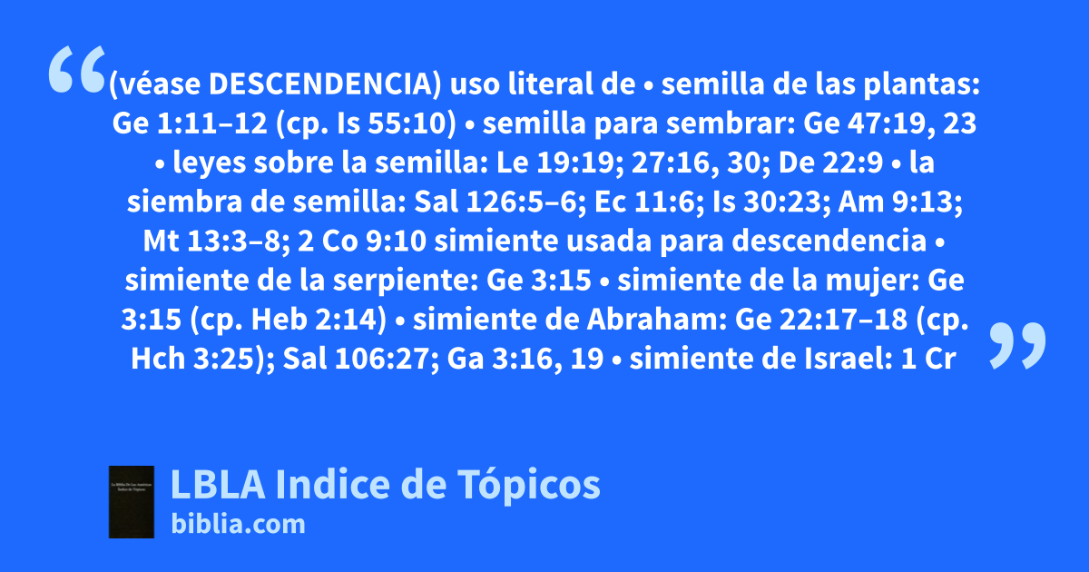 uso literal de • semilla de las plantas: Ge 1:11–12 (cp. Is 55:10) • semilla para sembrar: Ge 47:19, 23 • leyes sobre la semilla: Le 19:19; 27:16, 30; De 22:9 • la siembra de semilla: Sal 126:5–6; Ec 11:6; Is 30:23; Am 9:13; Mt 13:3–8; 2 Co 9:10