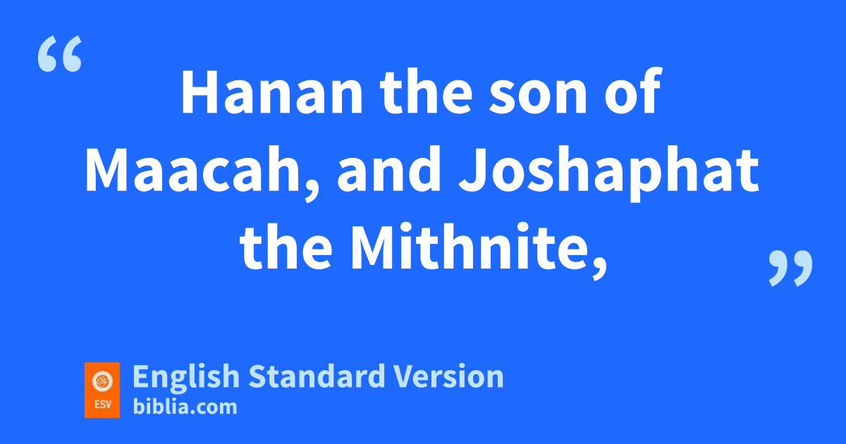 26 The mighty men were uAsahel the brother of Joab, Elhanan the son of Dodo of Bethlehem, 27 Shammoth of Harod,8 Helez the Pelonite, 28 Ira the son of Ikkesh of Tekoa, Abiezer of Anathoth, 29 Sibbecai the Hushathite, Ilai the Ahohite, 30 Maharai of Netophah, Heled the son of Baanah of Netophah, 31 Ithai the son of Ribai of Gibeah of the people of Benjamin, Benaiah of Pirathon, 32 Hurai of the brooks of Gaash, Abiel the Arbathite, 33 Azmaveth of Baharum, Eliahba the Shaalbonite, 34 Hashem9 the Gizonite, Jonathan the son of Shagee the Hararite, 35 Ahiam the son of Sachar the Hararite, Eliphal the son of Ur, 36 Hepher the Mecherathite, Ahijah the Pelonite, 37 Hezro of Carmel, Naarai the son of Ezbai, 38 Joel the brother of Nathan, Mibhar the son of vHagri, 39 Zelek the Ammonite, Naharai of Beeroth, the armor-bearer of Joab the son of Zeruiah, 40 Ira the Ithrite, Gareb the Ithrite, 41 Uriah the Hittite, wZabad the son of Ahlai, 42 Adina the son of Shiza the Reubenite, a leader of the Reubenites, and thirty with him, 43 Hanan the son of Maacah, and Joshaphat the Mithnite, 44 Uzzia the Ashterathite, Shama and Jeiel the sons of Hotham the Aroerite, 45 Jediael the son of Shimri, and Joha his brother, the Tizite, 46 Eliel the Mahavite, and Jeribai, and Joshaviah, the sons of Elnaam, and Ithmah the Moabite, 47 Eliel, and Obed, and Jaasiel the Mezobaite.
