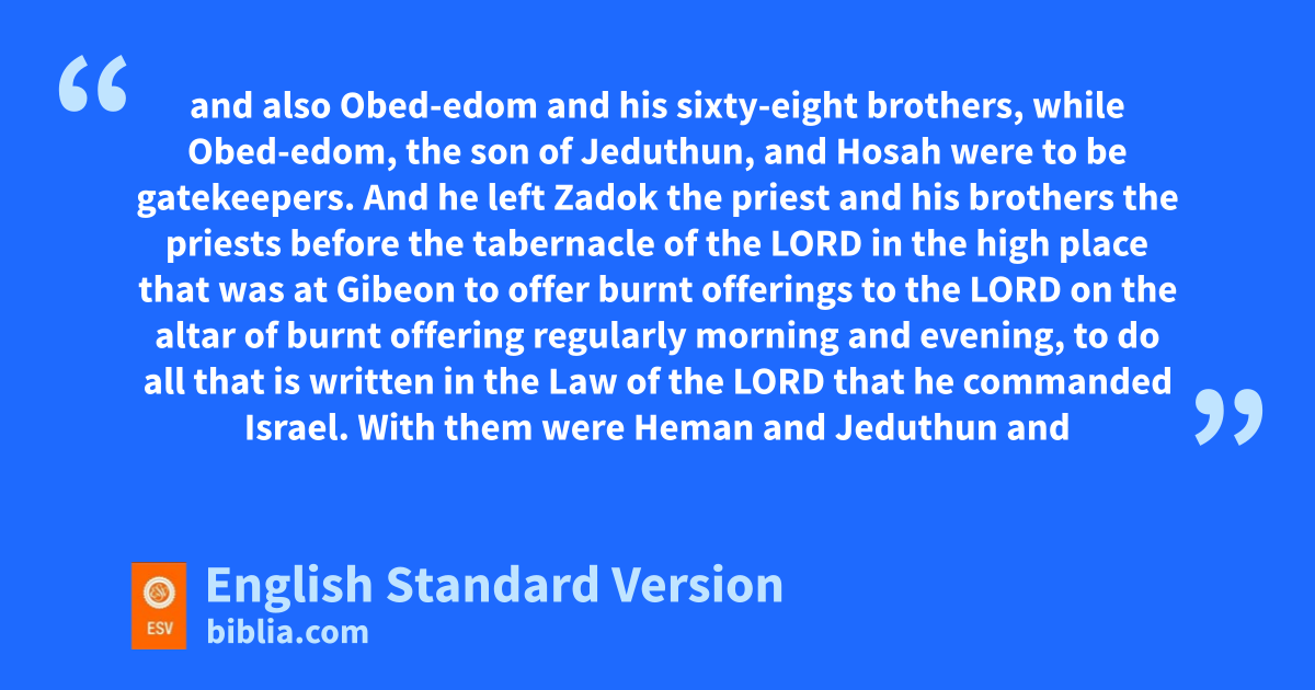 37 So David left Asaph and his brothers there fbefore the ark of the covenant of the Lord to minister regularly before the ark gas each day required, 38 and also hObed-edom and his3 sixty-eight brothers, while hObed-edom, the son of Jeduthun, and iHosah were to be gatekeepers. 39 And he left jZadok the priest and his brothers the priests before the tabernacle of the Lord kin the high place that was at Gibeon 40 to offer burnt offerings to the Lord lon the altar of burnt offering mregularly morning and evening, to do all that is written in the Law of the Lord that he commanded Israel. 41 With them were nHeman and Jeduthun oand the rest of those chosen and pexpressly named to give thanks to the Lord, qfor his steadfast love endures forever. 42 Heman and Jeduthun had trumpets and cymbals for the music and instruments rfor sacred song. The sons of Jeduthun were appointed to the gate.
