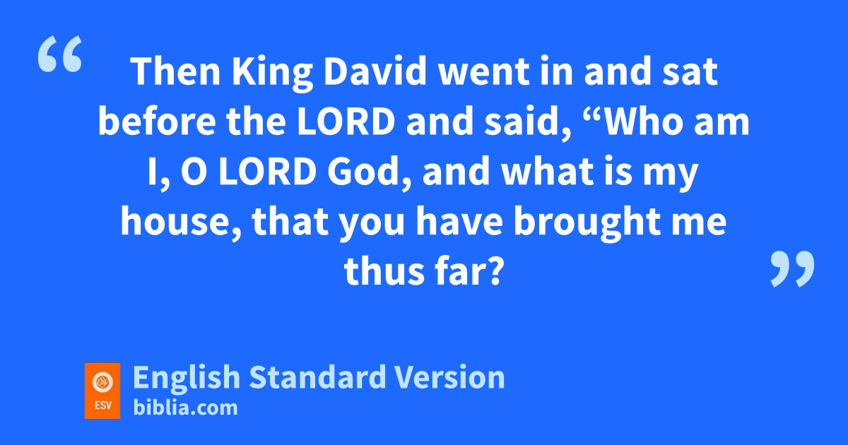 16 Then King David went in and sat before the Lord and said, “Who am I, O Lord God, and what is my house, that you have brought me thus far? 17 And this was a small thing in your eyes, O God. You have also spoken of your servant’s house for a great while to come, and have shown me future generations,1 O Lord God! 18 And what more can David say to you for honoring your servant? For you know your servant. 19 zFor your servant’s sake, O Lord, and according to your own heart, you have done all this greatness, in making known all these great things. 20 There is none like you, O Lord, and there is no God besides you, according to all that we have heard with our ears. 21 And who is like your people Israel, the one2 nation on earth whom God went to redeem to be his people, making for yourself a name for great and awesome things, in driving out nations before your people whom you redeemed from Egypt? 22 And you made your people Israel to be your people forever, and you, O Lord, became their God. 23 And now, O Lord, let the word that you have spoken concerning your servant and concerning his house be established forever, and do as you have spoken, 24 and your name will be established and magnified forever, saying, ‘The Lord of hosts, the God of Israel, is Israel’s God,’ and the house of your servant David will be established before you. 25 For you, my God, have revealed to your servant that you will build a house for him. Therefore your servant has found courage to pray before you. 26 And now, O Lord, you are God, and you have promised this good thing to your servant. 27 Now you have been pleased to bless the house of your servant, that it may continue forever before you, for it is you, O Lord, who have blessed, and it is blessed forever.”