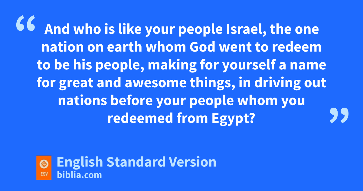 16 Then King David went in and sat before the Lord and said, “Who am I, O Lord God, and what is my house, that you have brought me thus far? 17 And this was a small thing in your eyes, O God. You have also spoken of your servant’s house for a great while to come, and have shown me future generations,1 O Lord God! 18 And what more can David say to you for honoring your servant? For you know your servant. 19 zFor your servant’s sake, O Lord, and according to your own heart, you have done all this greatness, in making known all these great things. 20 There is none like you, O Lord, and there is no God besides you, according to all that we have heard with our ears. 21 And who is like your people Israel, the one2 nation on earth whom God went to redeem to be his people, making for yourself a name for great and awesome things, in driving out nations before your people whom you redeemed from Egypt? 22 And you made your people Israel to be your people forever, and you, O Lord, became their God. 23 And now, O Lord, let the word that you have spoken concerning your servant and concerning his house be established forever, and do as you have spoken, 24 and your name will be established and magnified forever, saying, ‘The Lord of hosts, the God of Israel, is Israel’s God,’ and the house of your servant David will be established before you. 25 For you, my God, have revealed to your servant that you will build a house for him. Therefore your servant has found courage to pray before you. 26 And now, O Lord, you are God, and you have promised this good thing to your servant. 27 Now you have been pleased to bless the house of your servant, that it may continue forever before you, for it is you, O Lord, who have blessed, and it is blessed forever.”