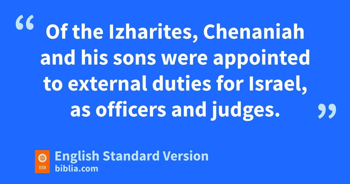 29 Of the Izharites, Chenaniah and his sons were appointed to yexternal duties for Israel, zas officers and judges. 30 Of the Hebronites, aHashabiah and his brothers, 1,700 men of ability, had the oversight of Israel westward of the Jordan for all the work of the Lord and for the service of the king. 31 Of the Hebronites, bJerijah was chief of the Hebronites of whatever genealogy or fathers’ houses. (In the fortieth year of David’s reign search was made and men of great ability among them were found at cJazer in Gilead.) 32 King David appointed him and his brothers, 2,700 men of ability, heads of fathers’ houses, to have the oversight of the Reubenites, the Gadites and the half-tribe of the Manassites for everything pertaining to God and for dthe affairs of the king.