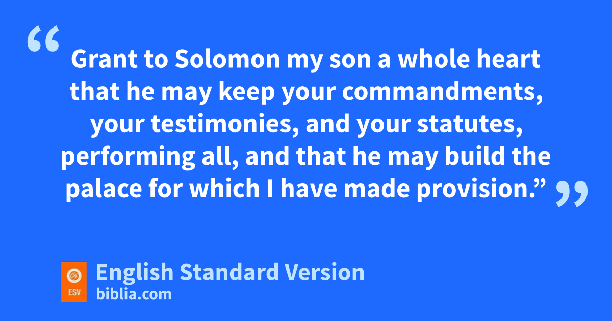 14 “But who am I, and what is my people, that we should be able thus to offer willingly? For all things come from you, and of your own have we given you. 15 dFor we are strangers before you and sojourners, as all our fathers were. Our days on the earth are elike a shadow, and there is no abiding.5 16 O Lord our God, all this abundance that we have provided for building you a house for your holy name comes from your hand and is all your own. 17 I know, my God, fthat you test the heart and ghave pleasure in uprightness. In the uprightness of my heart I have freely offered all these things, and now I have seen your people, who are present here, offering freely and joyously to you. 18 O Lord, the God of Abraham, Isaac, and Israel, our fathers, keep forever such purposes and thoughts in the hearts of your people, and direct their hearts toward you. 19 hGrant to Solomon my son a whole heart that he may keep your commandments, your testimonies, and your statutes, performing all, and that he may ibuild the palace jfor which I have made provision.”