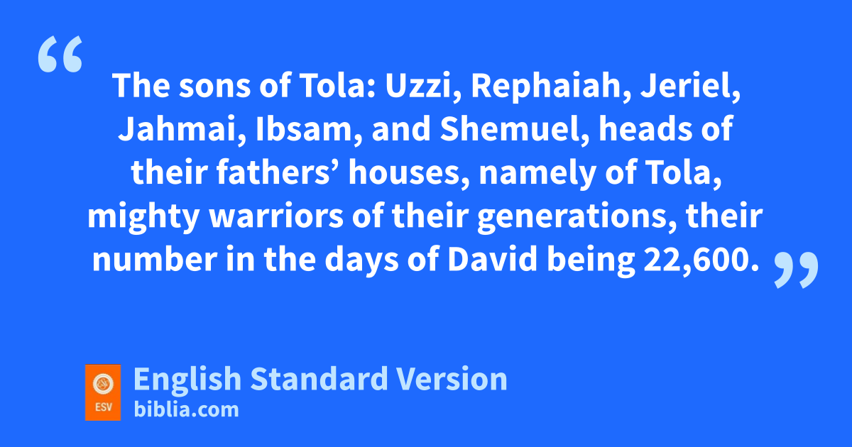 7 The sons1 of Issachar: Tola, iPuah, jJashub, and Shimron, four. 2 The sons of Tola: Uzzi, Rephaiah, Jeriel, Jahmai, Ibsam, and Shemuel, heads of their fathers’ houses, namely of Tola, mighty warriors of their generations, their number kin the days of David being 22,600. 3 The son2 of Uzzi: Izrahiah. And the sons of Izrahiah: Michael, Obadiah, Joel, and Isshiah, all five of them were chief men. 4 And along with them, by their generations, according to their fathers’ houses, were units of the army for war, 36,000, for they had many wives and sons. 5 Their kinsmen belonging to all the clans of Issachar were in all 87,000 mighty warriors, enrolled by genealogy.