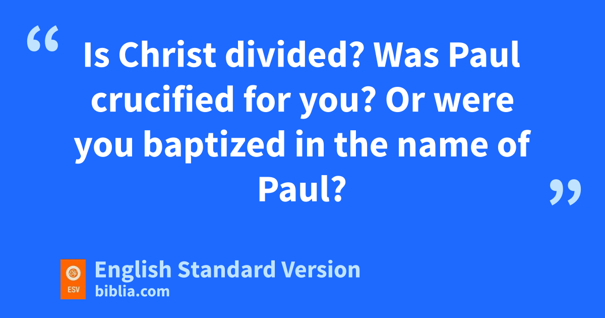 10 I appeal to you, brothers,1 by the name of our Lord Jesus Christ, that all of you agree, and that there be no pdivisions among you, but that you be united qin the same mind and the same judgment. 11 For it has been reported to me by Chloe’s people that there is rquarreling among you, my brothers. 12 What I mean is that seach one of you says, “I follow Paul,” or “I follow tApollos,” or “I follow uCephas,” or “I follow Christ.” 13 vIs Christ divided? Was Paul crucified for you? Or were you wbaptized in the name of Paul? 14 I thank God that I baptized none of you except xCrispus and yGaius, 15 so that no one may say that you were baptized in my name. 16 (I did baptize also zthe household of Stephanas. Beyond that, I do not know whether I baptized anyone else.) 17 For Christ did not send me to baptize but to preach the gospel, and anot with words of eloquent wisdom, lest the cross of Christ be emptied of its power.