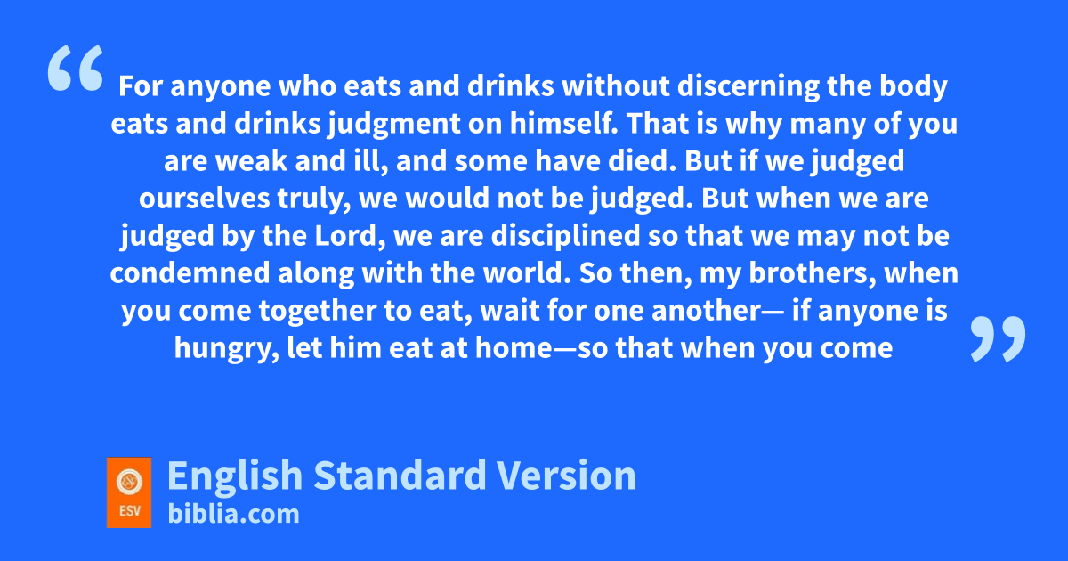 27 aWhoever, therefore, eats the bread or drinks the cup of the Lord bin an unworthy manner will be guilty concerning cthe body and blood of the Lord. 28 dLet a person examine himself, then, and so eat of the bread and drink of the cup. 29 For anyone who eats and drinks without discerning the body eats and drinks judgment on himself. 30 That is why many of you are weak and ill, and some ehave died.8 31 fBut if we judged9 ourselves truly, we would not be judged. 32 But when we are judged by the Lord, gwe are disciplined10 so that we may not be hcondemned along with the world.
