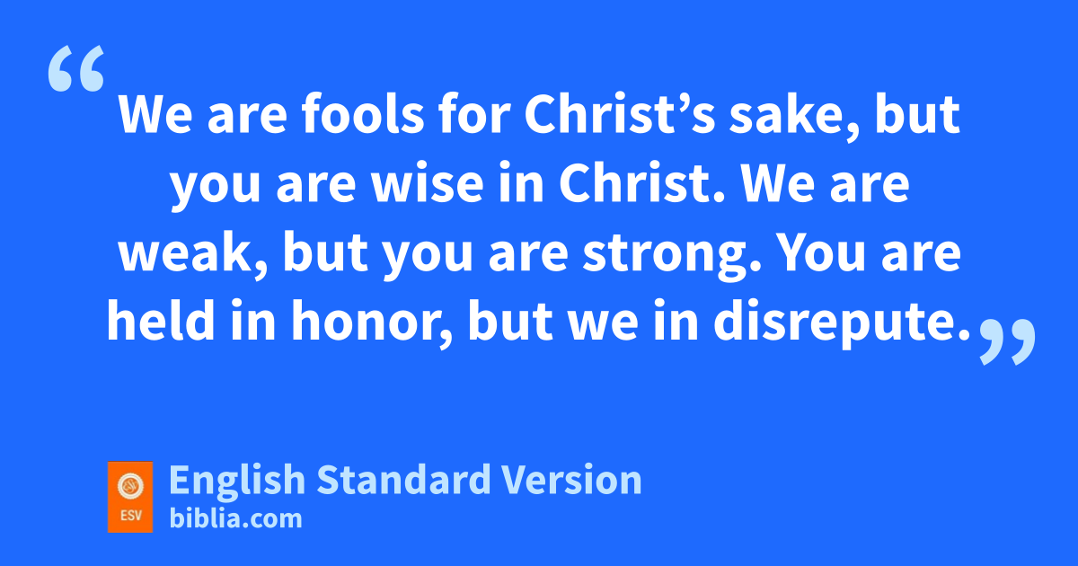 8 Already you have all you want! Already you have become rich! Without us you have become kings! And would that you did reign, so that we might share the rule with you! 9 For I think that God has exhibited us apostles as last of all, wlike men sentenced to death, because we xhave become a spectacle to the world, to angels, and to men. 10 yWe are fools for Christ’s sake, but zyou are wise in Christ. aWe are weak, but you are strong. You are held in honor, but we in disrepute. 11 To the present hour bwe hunger and thirst, we are poorly dressed and cbuffeted and dhomeless, 12 and we elabor, working with our own hands. fWhen reviled, we bless; gwhen persecuted, we endure; 13 when slandered, we entreat. hWe have become, and are still, like the scum of the world, ithe refuse of all things.