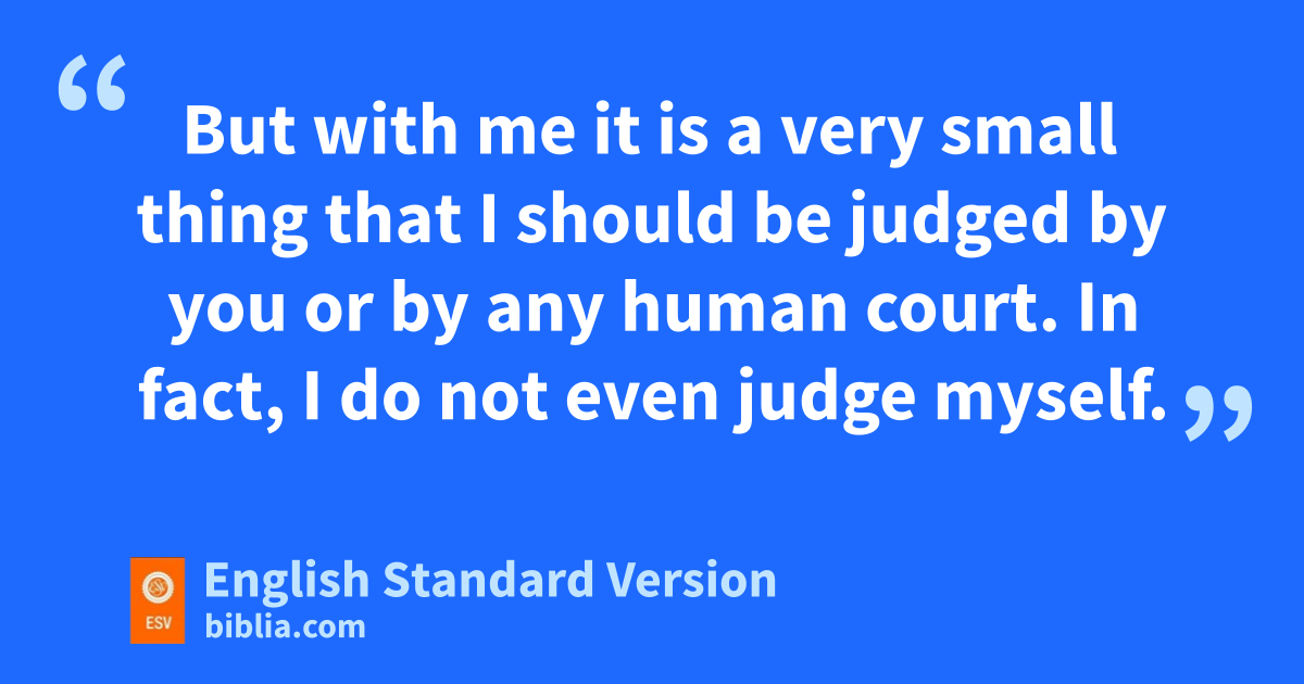 4 This is how one should regard us, as servants of Christ and nstewards of the mysteries of God. 2 Moreover, it is required of stewards that they be found faithful. 3 But with me it is a very small thing that I should be judged by you or by any human court. In fact, I do not even judge myself. 4 oFor I am not aware of anything against myself, pbut I am not thereby acquitted. It is the Lord who judges me. 5 Therefore qdo not pronounce judgment before the time, rbefore the Lord comes, swho will bring to light the things now hidden in darkness and will disclose the purposes of the heart. tThen each one will receive his commendation from God.