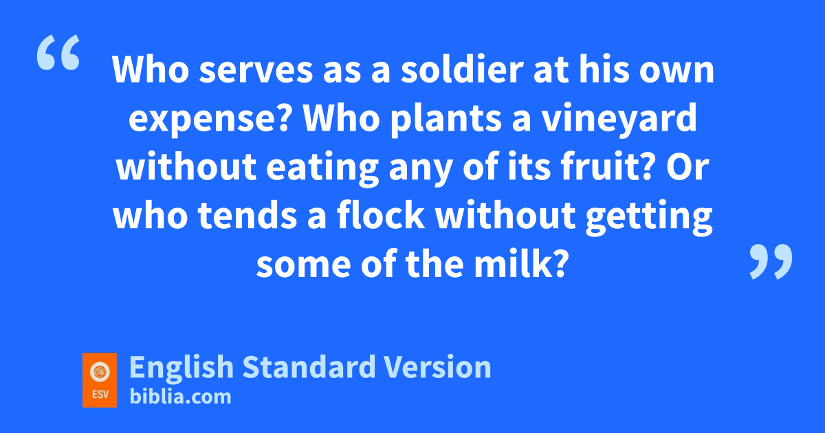 3 This is my defense to those who would examine me. 4 oDo we not have the right to eat and drink? 5 pDo we not have the right to take along a believing wife,1 as do the other apostles and qthe brothers of the Lord and rCephas? 6 Or is it only Barnabas and I who have no right to refrain from working for a living? 7 sWho serves as a soldier at his own expense? tWho plants a vineyard without eating any of its fruit? Or who tends a flock without getting some of the milk?