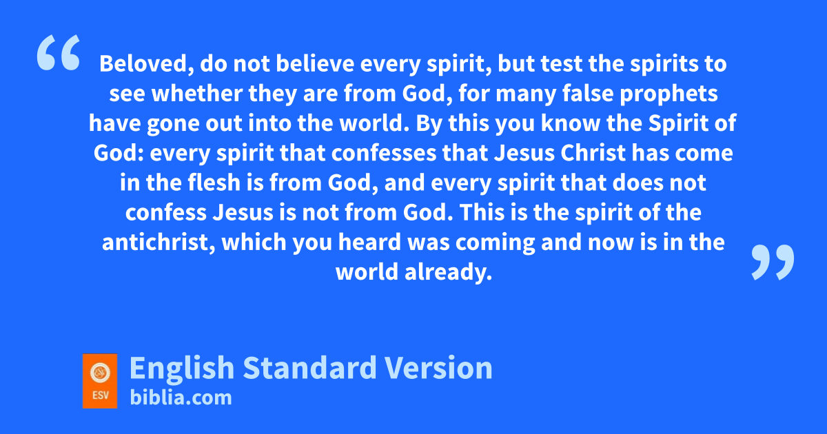 4 Beloved, tdo not believe every spirit, but utest the spirits to see whether they are from God, for vmany wfalse prophets xhave gone out into the world. 2 By this you know the Spirit of God: yevery spirit that confesses that zJesus Christ has come in the flesh is from God, 3 and every spirit athat does not confess Jesus is not from God. This is the spirit of the antichrist, which you heard was coming and bnow is in the world already. 4 Little children, you are from God and have overcome them, for che who is in you is greater than dhe who is in the world. 5 eThey are from the world; therefore they speak from the world, and fthe world listens to them. 6 We are from God. gWhoever knows God listens to us; whoever is not from God does not listen to us. By this we know hthe Spirit of truth and ithe spirit of error.
