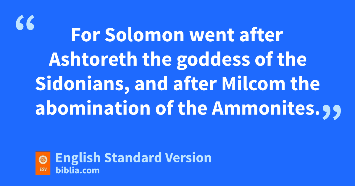 11 Now wKing Solomon loved many foreign women, along with the daughter of Pharaoh: Moabite, Ammonite, Edomite, Sidonian, and Hittite women, 2 from the nations concerning which the Lord had said to the people of Israel, x“You shall not enter into marriage with them, neither shall they with you, for surely they will turn away your heart after their gods.” Solomon clung to these in love. 3 He had 700 wives, who were princesses, and 300 concubines. And his wives turned away his heart. 4 For when Solomon was old his wives turned away his heart after other gods, and yhis heart was not wholly true to the Lord his God, zas was the heart of David his father. 5 For Solomon went after aAshtoreth the goddess of the Sidonians, and after bMilcom the abomination of the Ammonites. 6 So Solomon did what was evil in the sight of the Lord and did not wholly follow the Lord, as David his father had done. 7 Then Solomon built a high place for cChemosh the abomination of Moab, and for dMolech the abomination of the Ammonites, on the mountain east of Jerusalem. 8 And so he did for all his foreign wives, who made offerings and sacrificed to their gods.