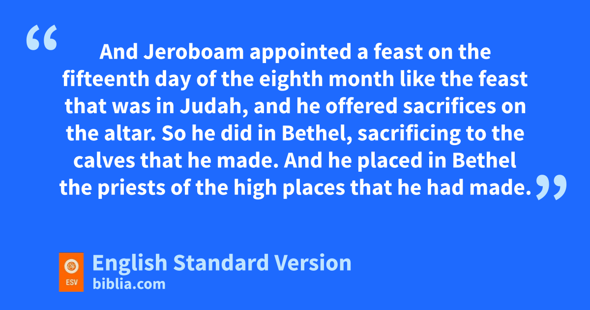 25 Then Jeroboam abuilt Shechem in the hill country of Ephraim and lived there. And he went out from there and bbuilt Penuel. 26 And Jeroboam said in his heart, “Now the kingdom will turn back to the house of David. 27 If this people cgo up to offer sacrifices in the temple of the Lord at Jerusalem, then the heart of this people will turn again to their lord, to Rehoboam king of Judah, and they will kill me and return to Rehoboam king of Judah.” 28 So the king took counsel and dmade two calves of gold. And he said to the people, “You have gone up to Jerusalem long enough. eBehold your gods, O Israel, who brought you up out of the land of Egypt.” 29 And he set one in Bethel, and the other he put in Dan. 30 Then fthis thing became a sin, for the people went as far as Dan to be before one.2 31 He also made gtemples on high places and happointed priests from among all the people, who were not of the Levites. 32 And Jeroboam appointed a feast on the fifteenth day of the eighth month like ithe feast that was in Judah, and he offered sacrifices on the altar. So he did in Bethel, sacrificing to the calves that he made. And he placed in Bethel jthe priests of the high places that he had made. 33 He went up to the altar that he had made in Bethel on the fifteenth day in the eighth month, in the month that he had devised from his own heart. And he instituted a feast for the people of Israel and went up to the altar kto make offerings.