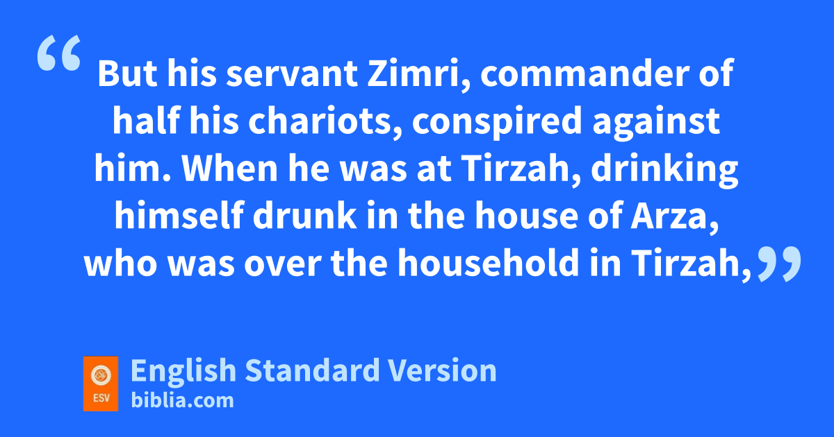 8 In the twenty-sixth year of Asa king of Judah, Elah the son of Baasha began to reign over Israel in Tirzah, and he reigned two years. 9 But his servant xZimri, commander of half his chariots, conspired against him. When he was at Tirzah, drinking himself drunk in the house of Arza, ywho was over the household in Tirzah, 10 Zimri came in and struck him down and killed him, in the twenty-seventh year of Asa king of Judah, and reigned in his place.