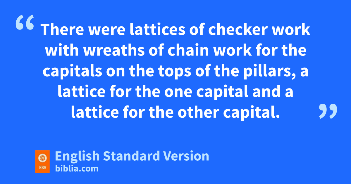 15 hHe cast itwo pillars of bronze. jEighteen cubits was the height of one pillar, and a line of twelve cubits measured its circumference. It was hollow, and its thickness was four fingers. The second pillar was the same.5 16 He also made two capitals of cast bronze to set on the tops of the pillars. The height of the one capital was five cubits, and jthe height of the other capital was five cubits. 17 There were lattices of checker work with wreaths of chain work for the capitals on the tops of the pillars, a lattice6 for the one capital and a lattice for the other capital. 18 Likewise he made pomegranates7 in two rows around the one latticework to cover the capital that was on the top of the pillar, and he did the same with the other capital. 19 Now the capitals that were on the tops of the pillars in the vestibule were of lily-work, four cubits. 20 The capitals were on the two pillars and also above the rounded projection which was beside the latticework. There were ktwo hundred pomegranates in two rows all around, and so with the other capital. 21 lHe set up the pillars at the vestibule of the temple. He set up the pillar on the south and called its name Jachin, and he set up the pillar on the north and called its name Boaz. 22 And on the tops of the pillars was lily-work. Thus the work of the pillars was finished.