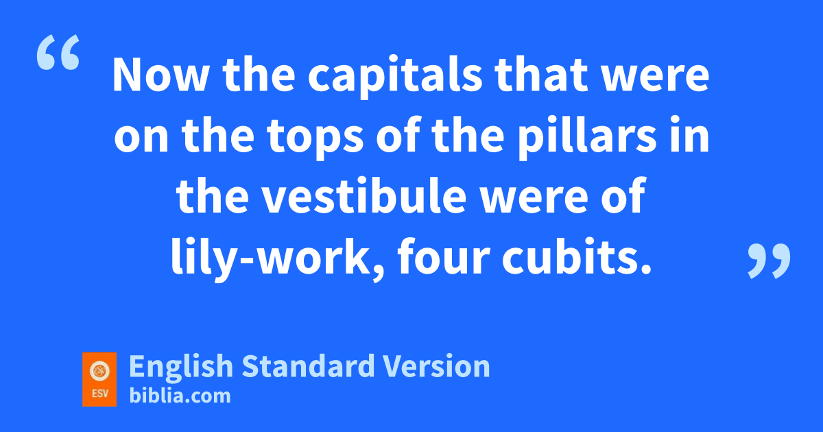 15 hHe cast itwo pillars of bronze. jEighteen cubits was the height of one pillar, and a line of twelve cubits measured its circumference. It was hollow, and its thickness was four fingers. The second pillar was the same.5 16 He also made two capitals of cast bronze to set on the tops of the pillars. The height of the one capital was five cubits, and jthe height of the other capital was five cubits. 17 There were lattices of checker work with wreaths of chain work for the capitals on the tops of the pillars, a lattice6 for the one capital and a lattice for the other capital. 18 Likewise he made pomegranates7 in two rows around the one latticework to cover the capital that was on the top of the pillar, and he did the same with the other capital. 19 Now the capitals that were on the tops of the pillars in the vestibule were of lily-work, four cubits. 20 The capitals were on the two pillars and also above the rounded projection which was beside the latticework. There were ktwo hundred pomegranates in two rows all around, and so with the other capital. 21 lHe set up the pillars at the vestibule of the temple. He set up the pillar on the south and called its name Jachin, and he set up the pillar on the north and called its name Boaz. 22 And on the tops of the pillars was lily-work. Thus the work of the pillars was finished.