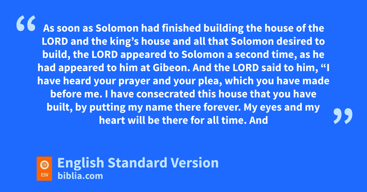 9 jAs soon as Solomon had finished building the house of the Lord kand the king’s house and lall that Solomon desired to build, 2 mthe Lord appeared to Solomon a second time, as he had appeared to him at Gibeon. 3 And the Lord said to him, “I have heard your prayer and your plea, which you have made before me. I have consecrated this house that you have built, nby putting my name there forever. oMy eyes and my heart will be there for all time. 4 And as for you, if you will pwalk before me, qas David your father walked, with integrity of heart and uprightness, doing according to all that I have commanded you, and keeping my statutes and my rules, 5 rthen I will establish your royal throne over Israel forever, as I promised David your father, saying, ‘You shall not lack a man on the throne of Israel.’ 6 sBut if you turn aside from following me, you or your children, and do not keep my commandments and my statutes that I have set before you, but go and serve other gods and worship them, 7 tthen I will cut off Israel from the land that I have given them, uand the house that I have consecrated for my name I will cast out of my sight, vand Israel will become a proverb and a byword among all peoples. 8 And this house will become a heap of ruins.1 Everyone passing by it will be astonished and will hiss, and they will say, w‘Why has the Lord done thus to this land and to this house?’ 9 Then they will say, ‘Because xthey abandoned the Lord their God who brought their fathers out of the land of Egypt and laid hold on other gods and worshiped them and served them. Therefore the Lord has brought all this disaster on them.’ ”