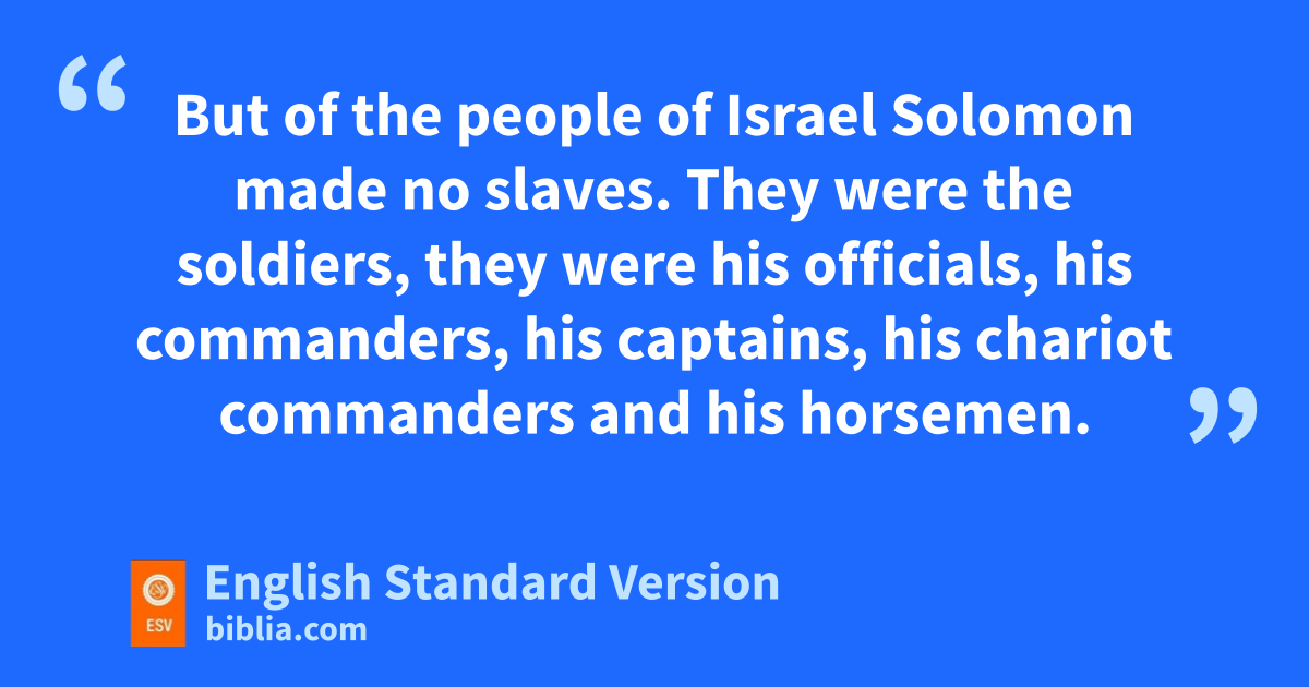 15 And this is the account of bthe forced labor that King Solomon drafted to build the house of the Lord and his own house and cthe Millo and the wall of Jerusalem and dHazor and eMegiddo and Gezer 16 (Pharaoh king of Egypt had gone up and captured Gezer and burned it with fire, and had killed fthe Canaanites who lived in the city, and had given it as dowry to ghis daughter, Solomon’s wife; 17 so Solomon rebuilt Gezer) and hLower Beth-horon 18 and Baalath and Tamar in the wilderness, in the land of Judah,3 19 and all the store cities that Solomon had, and ithe cities for his chariots, and the cities for jhis horsemen, and whatever Solomon kdesired to build in Jerusalem, in Lebanon, and in all the land of his dominion. 20 All the people who were left of the Amorites, the Hittites, the Perizzites, the Hivites, and the Jebusites, who were not of the people of Israel— 21 ltheir descendants who were left after them in the land, mwhom the people of Israel were unable to devote to destruction4—nthese Solomon drafted to be oslaves, and so they are to this day. 22 But pof the people of Israel Solomon made no slaves. They were the soldiers, they were his officials, his commanders, his captains, his chariot commanders and his horsemen.