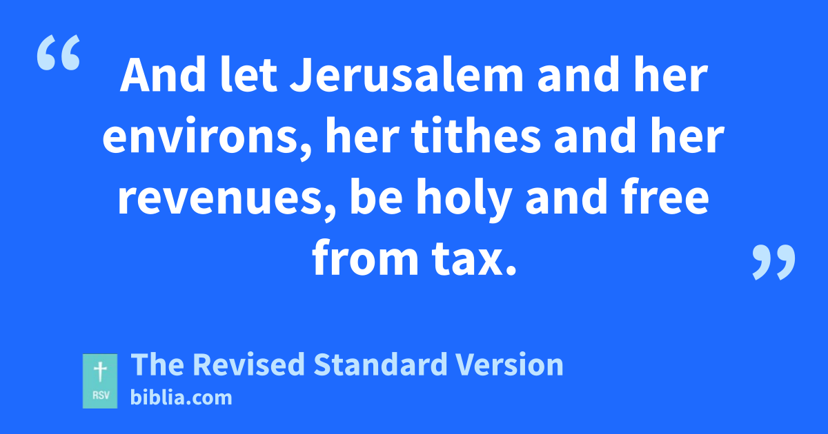 29 “And now I free you and exempt all the Jews from payment of tribute and salt tax and crown levies, 30 and instead of collecting the third of the grain and the half of the fruit of the trees that I should receive, I release them from this day and henceforth. I will not collect them from the land of Judah or from the three districts added to it from Samaria and Galilee, from this day and for all time. 31 And let Jerusalem and her environs, her tithes and her revenues, be holy and free from tax. 32 I release also my control of the citadel in Jerusalem and give it to the high priest, that he may station in it men of his own choice to guard it. 33 And every one of the Jews taken as a captive from the land of Judah into any part of my kingdom, I set free without payment; and let all officials cancel also the taxes on their cattle.