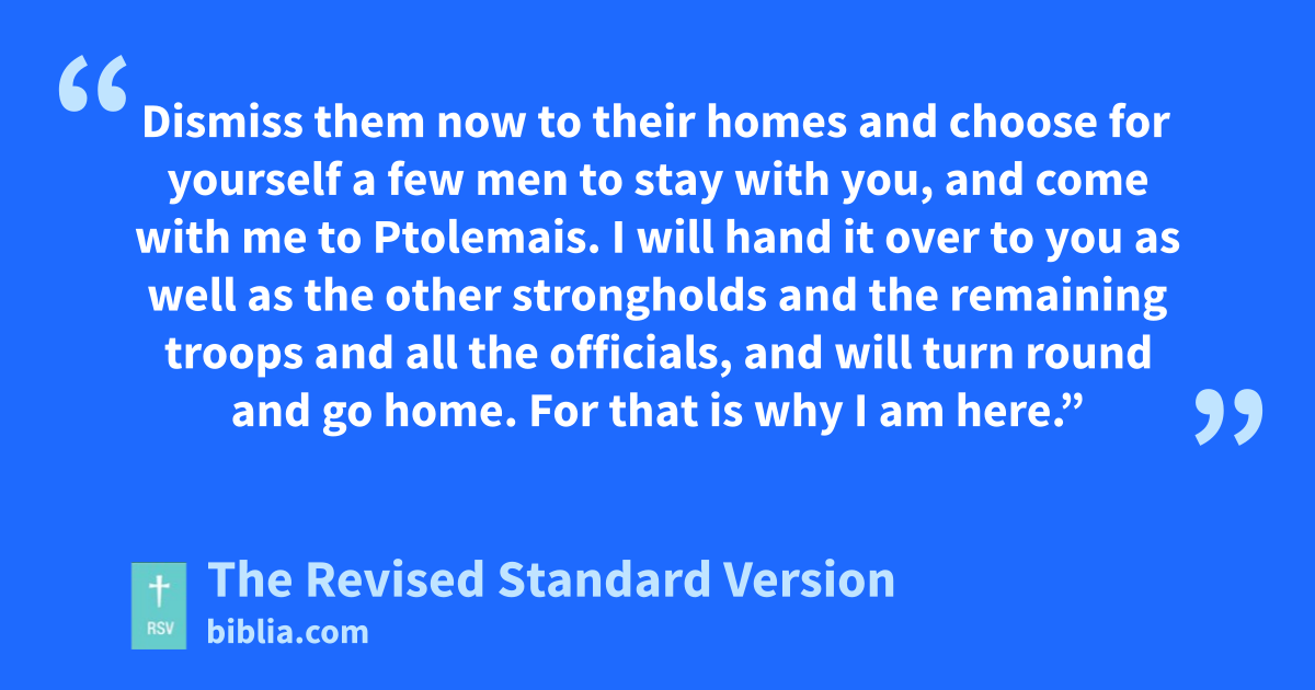 39 Then Trypho attempted to become king in Asia and put on the crown, and to raise his hand against Antiochus the king. 40 He feared that Jonathan might not permit him to do so, but might make war on him, so he kept seeking to seize and kill him, and he marched forth and came to Beth-shan. 41 Jonathan went out to meet him with forty thousand picked fighting men, and he came to Beth-shan. 42 When Trypho saw that he had come with a large army, he was afraid to raise his hand against him. 43 So he received him with honor and commended him to all his friends, and he gave him gifts and commanded his friends and his troops to obey him as they would himself. 44 Then he said to Jonathan, “Why have you wearied all these people when we are not at war? 45 Dismiss them now to their homes and choose for yourself a few men to stay with you, and come with me to Ptolemais. I will hand it over to you as well as the other strongholds and the remaining troops and all the officials, and will turn round and go home. For that is why I am here.”