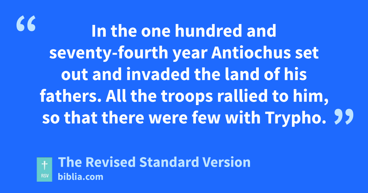 10 In the one hundred and seventy-fourth year Antiochus set out and invaded the land of his fathers. All the troops rallied to him, so that there were few with Trypho. 11 Antiochus pursued him, and he came in his flight to Dor, which is by the sea; 12 for he knew that troubles had converged upon him, and his troops had deserted him. 13 So Antiochus encamped against Dor, and with him were a hundred and twenty thousand warriors and eight thousand cavalry. 14 He surrounded the city, and the ships joined battle from the sea; he pressed the city hard from land and sea, and permitted no one to leave or enter it.